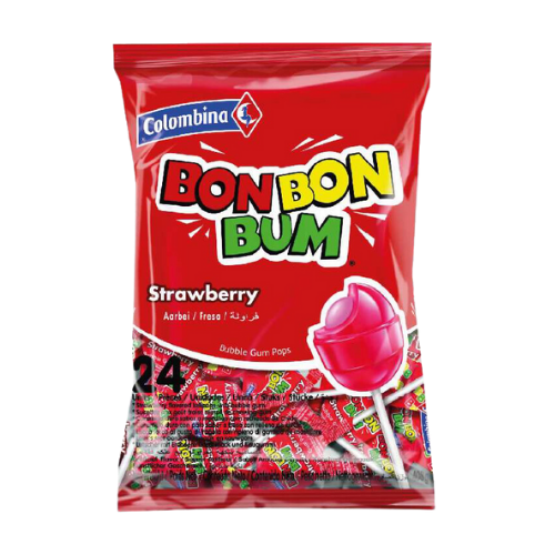 Bon Bon Bum de fresa es una paleta colombiana con sabor intenso a fresa y centro de chicle. Ideal para niños y adultos, combina dulzura y diversión en cada bocado.