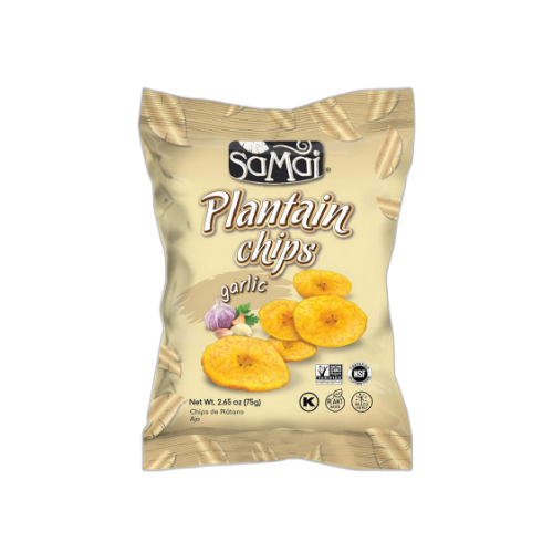 Rodajas de plátano verde fritas y sazonadas con ajo. Snack sabroso, crujiente y con sabor latino.